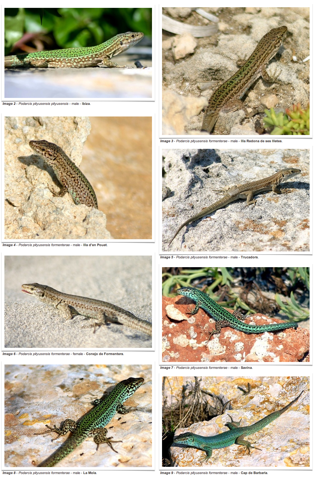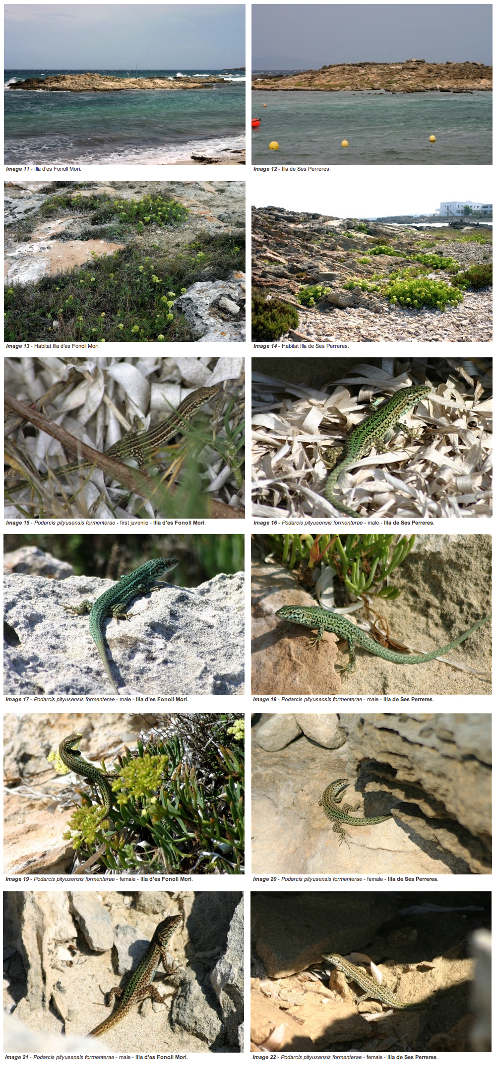 The Ibiza wall lizard, Podarcis pityusensis (Boscá, 1883), endemic to the Pityusic islands (Ibiza, Formentera and 41 adjacent islands) is today devided into 23 subspecies. South to the Es Freus channel, deviding Formentera from Ibiza, there are 8 known populations on islands besides the Formentera population, inhabited by 3 current recognized subspecies; Illa Torreta - Podarcis pityusensis torretensis (Buchholz, 1954), Illa Gastaví - Podarcis pityusensis gastabiensis (Eisentraut, 1928), and Illa d’en Pou, Illa s’Espalmador, Illa s’Espardell, Illa s’Alga, Illa d’es Pouet, Illa Redona de ses Illetes, and Formentera - Podarcis pityusensis formenterae (Eisentraut, 1928). (see: Image 1).