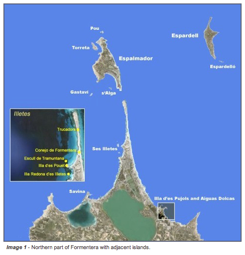 Beside the 8 inhabited islands there are 3 rocks which are not investigated in the Ses Illetes group, and 3 islands which are considered uninhabited; Illa s’Espardelló, Illa d’es Pujols (one islet and one rock), and Aiguas Dolcas (two islets and two rocks) (Salvador 1986, 2006).
