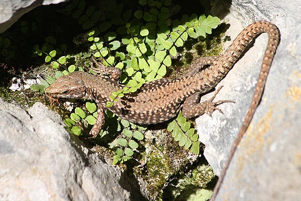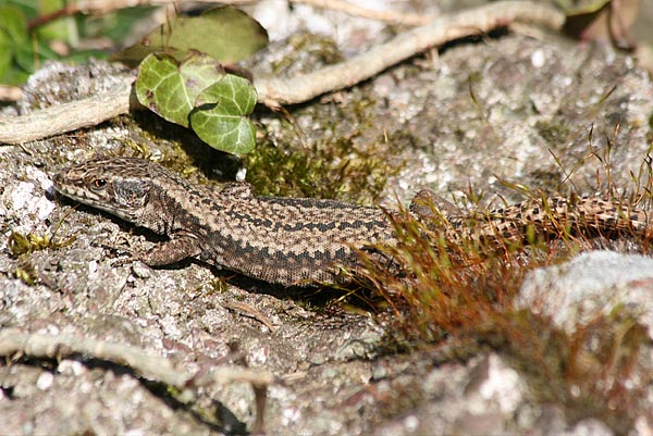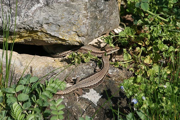 Eigentlich wollte ich in der Umgebung von Quinten nach dort ausgesetzten Äskulapnattern suchen und sie fotografieren. Leider habe ich keine gefunden. Dafür eine Individuen starke Population von Mauereidechsen. Westlich des Ortes scheinen die Tiere alles zu ihrem Lebensraum gemacht zu haben. Man findet sie überall, an Legesteinmauern, Wald- und Wegrändern, Geröllhalden, Zäunen, ein Paar konnte ich sogar oben auf einem Jägerstand finden.