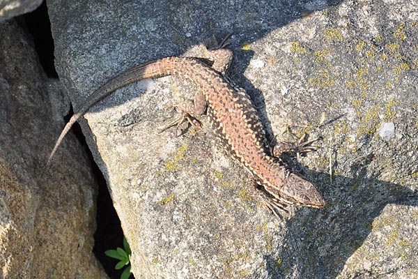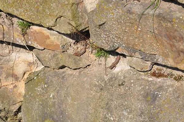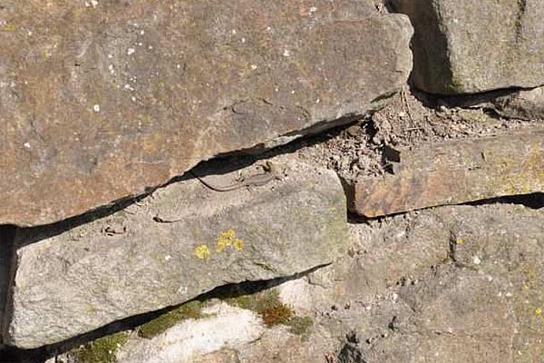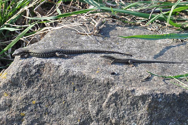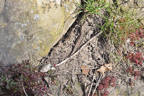 Die von mir beobachteten Mauereidechsen besiedeln beide Bereiche, wobei ein übersiedeln theoretisch nicht auszuschließen ist. Mauer "2" liegt genau in Südrichtung nur durch einen ca. 3 Meter breiten Streifen Wiese von der Straße getrennt. An dieser Mauer habe ich die meisten Individuen gezählt. Im April 2011 entstanden bei herrlichem Wetter und nach der ersten Häutung die nachfolgenden Bilder an Mauer "2"