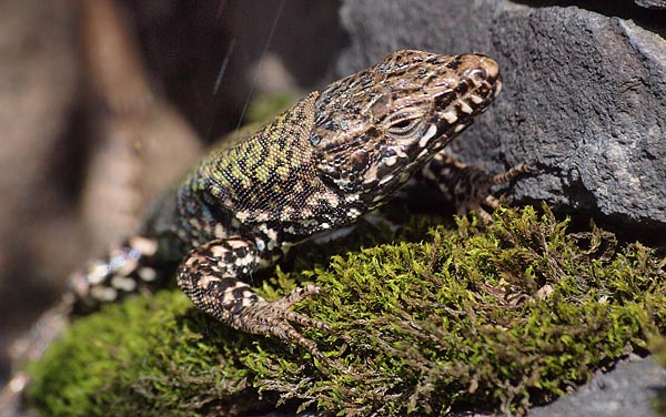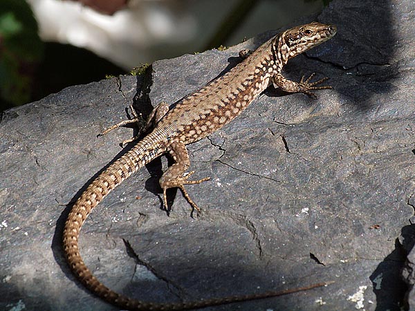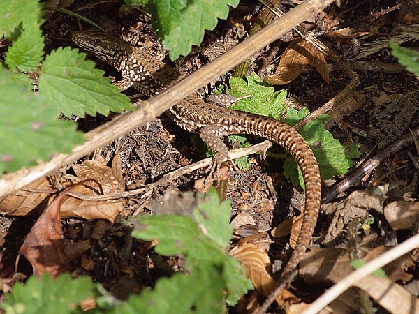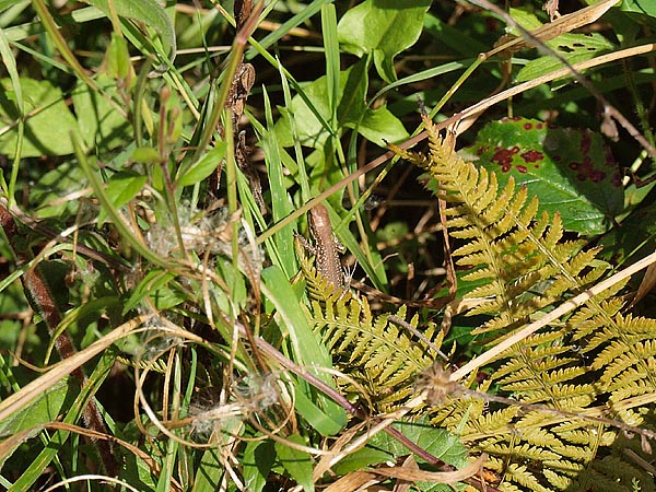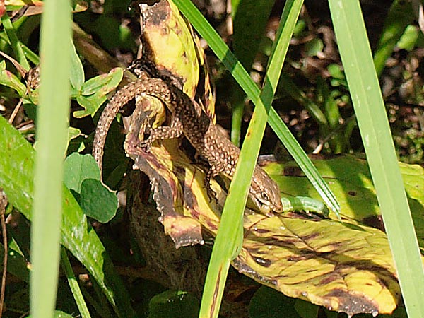 Ein dort zwischen dem ganzen Grün liegender dunkler Stein diente insgesamt zwei erwachsenen Mauereidechsen als Sonnenplatz, eine davon konnte ich fotografieren (Bild 3+4).
