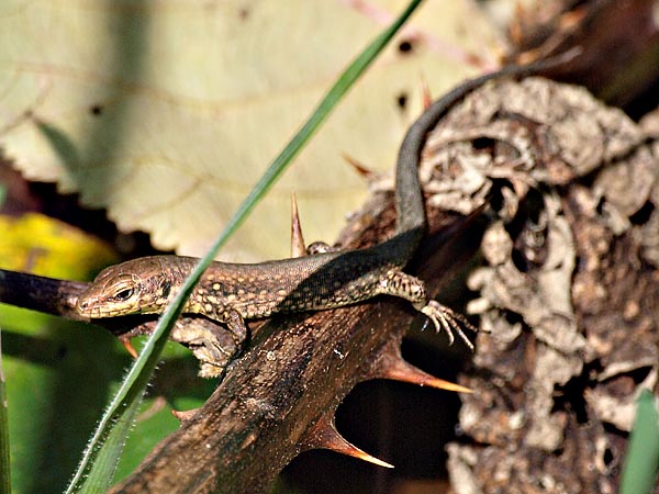 Weitere größere Tiere fand ich auf dem kleinen Abschnitt nicht, aber was dann alles im Gras an kleinen Mauereidechsen unterwegs war (Länge über Schwanz geschätzt ab 4 cm), überraschte mich doch. Zählen konnte ich sie nicht, aber es waren weit mehr als 10 Tiere, die man ohne Mühe sofort sehen konnte. An Hand von Bild 5 kann man schön sehen, wie klein sie sind, die Dornen sehen doch ziemlich groß aus.