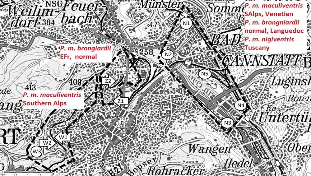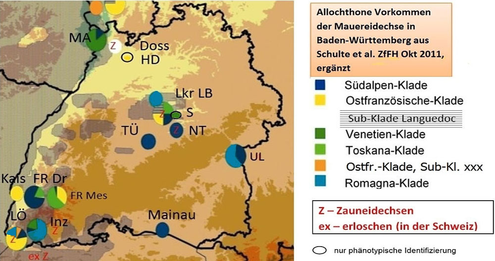 Bis zum Redaktionsschluss waren uns 19 Vorkommen allochthoner Mauereidechsen in Baden-Württemberg bekannt, die alle im Bereich mit den Eckpunkten Mannheim – Stuttgart – Ulm – Insel Mainau im Bodensee – Lörrach – Freiburg – Mannheim liegen, wobei die Gebiete um Mannheim, Stuttgart, Lörrach und Freiburg Häufungspunkte verschiedener genetischer Linien darstellen. An zwei Fundstellen siedeln ausschließlich ausgesetzte Tiere der ostfranzösischen Linie (P. m. brongniardii), an weiteren fünf Lokalitäten nur Tiere der Südalpenlinie (P. m. maculiventris), von denen drei nachgewiesenermaßen auf Aussetzungen zurückgehen und zwei vermutlich auf unbeabsichtigte Verschleppungen. Die restlichen zwölf Vorkommen umfassen mehrere genetische Linien verschiedener Einwanderungswege – außer den genannten die Unterlinie „Languedoc“ der ostfranzösischen Linie, die westfranzösische (jeweils P. m. brongniardii), die Venetienlinie (P. m. maculiventris) sowie die Toskana und Romagna-Linie (jeweils P. m. nigriventris). Hybridisierungen allochthoner Linien untereinander konnten belegt werden. An sechs Standorten wurden Hybridisierungen allochthoner mit der autochthonen ostfranzösischen Linie nachgewiesen, an einem weiteren wird eine Hybridisierung vermutet. An fünf Standorten allochthoner Mauereidechsen wurde Sympatrie/Syntopie mit der Zauneidechse (Lacerta agilis) beobachtet.