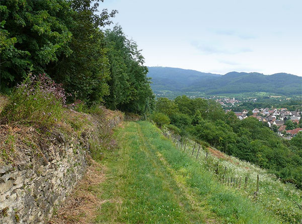 Abb. 1: The lower section of the trail with dry wall, abandoned vineyard, forest and the villages of Niedereggenen and Obereggenen in the background.