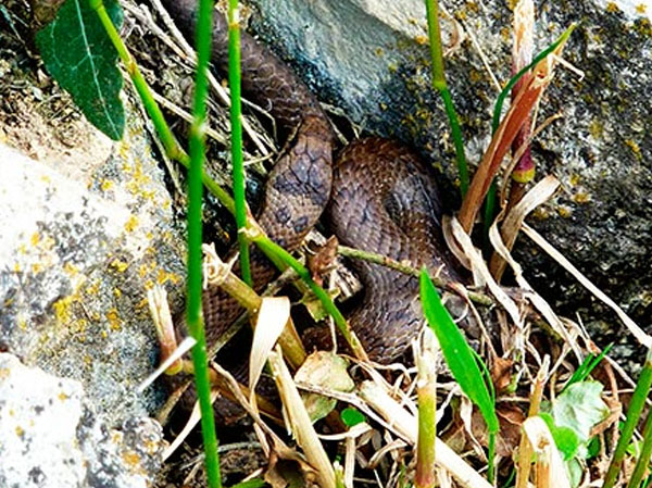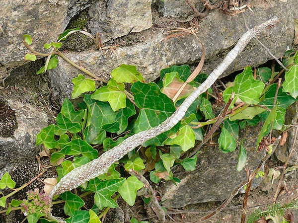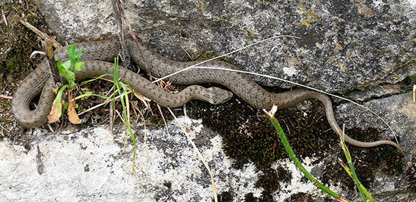Smooth Snakes (Coronella austriaca) prefer to live in the system of wall joints. Usually they bask partially hidden in vegetation where they are frequently overlooked due to their unspectacular grey or brown coloration. At the easiest, one can discover their shed skins or sloughs.