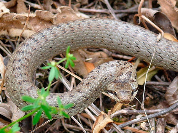 Abb. 14: If one gets too close to a Smooth Snake it takes a defensive posture as shown here against the photographer. Usually resting Smooth Snakes do not flee because they rely on their camouflage. However, they try to bite if they feel threatened when approached too closely. A strike leaves several blood drops which is as harmless as a rip by thorns. As a cautionary measure such injuries should be disinfected in order to avoid wound infections.