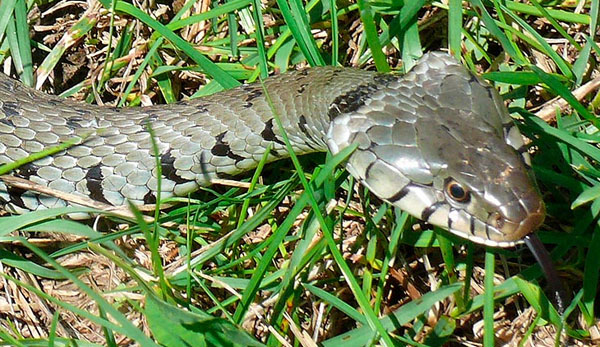 Western Grass Snakes (Natrix natrix helvetica) scavenge meadows and gardens for prey and like to use joints at the bottom of walls as shelters. In contrast to the bright yellow neck marks of the nominate form of the Grass Snake (Natrix natrix natrix), those of the western form are often pale or even missing. The black bars on the flanks are typical of the western sub-species.