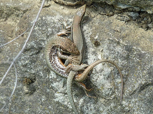 Abb. 4: Mating wall lizards. The male bites the flank of the female in order to generate support for pressing the cloacae together (photo: Dorothee Kling).