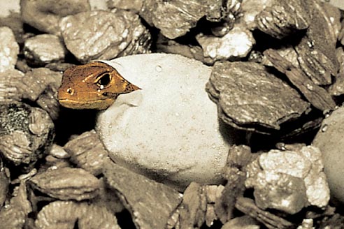 Beim Überführen des Geleges in den Brutkasten ist darauf zu achten, dass die Eier nicht gedreht werden. Zur Sicherheit kann die Oberseite vorsichtig mit einem Bleistift markiert werden. Zum Bebrüten verwenden wir die "Jäger-Kunstglucke" (Aufnahme 5 handelsübliche Grillen-Dosen) oder den Brutapparat der Firma Bruja, in dem 12 dieser Plastikdosen Platz finden. Beide Geräte sind Flächenbrüter und werden mit dem jeweils dazugehörigen Feuchtbruteinsatz betrieben. Die Bruttemperatur beträgt 27° - 28°. Bei diesen Temperaturen beträgt die Inkubationszeit 80-85 Tage. Als Brutsubstrat eignet sich Vermiculit in mittlerer Körnung am besten. Das Vermiculit wird in die Plastikdose gefüllt und mit Wasser im Verhältnis 1 : 1,5 Gewichtsanteilen gemischt. In unserem Fall 40 Gramm Vermiculit mit 60 Gramm Wasser. Um den Sauerstoffaustausch zu gewährleisten, haben wir den Deckel der Dose mit einigen kleinen Löchern perforiert. Die Eier wurden dann in kleine Mulden, die mit dem Finger in das Substrat gedrückt wurden, eingebettet. Damit das Vermiculit während der gesamten Zeitigungsdauer eine gleichbleibende Feuchtigkeit hat, wiegen wir das Plastikdöschen nach dem Einbringen der Eier. Das Gewicht wird einmal in der Woche geprüft und der Gewichtsverlust durch Zugabe von Wasser ausgeglichen. Dabei ist zu beachten, dass beim Nachfüllen das Wasser nicht direkt auf die Eier gegeben wird. Mit einer 5 ml Einwegspritze (ohne Nadel) lässt sich das Wasser sehr gut dosieren und in das Substrat träufeln.