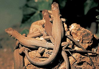 Wenn die Möglichkeit besteht, die Tiere bei etwa 5-7° zu überwintern, ist dies sicherlich zu empfehlen. Bei diesen Temperaturen können die Eidechsen etwa zwei Monate lang ruhen. Wichtig ist eine ausreichende Feuchtigkeit (nicht Nässe) im Bodensubstrat. Einige Halter überwintern ihre Eidechsen mit gutem Erfolg in einem Kühlschrank. Unsere Eidechsen halten nur eine Art Pseudowinterruhe im Terrarium von einigen Wochen. Während dieser Zeit wird einfach nur die Beleuchtung abgeschaltet. Insgesamt versuchen wir den Wechsel der Jahreszeiten durch eine ansteigende und abfallende Beleuchtungsdauer zu simulieren.