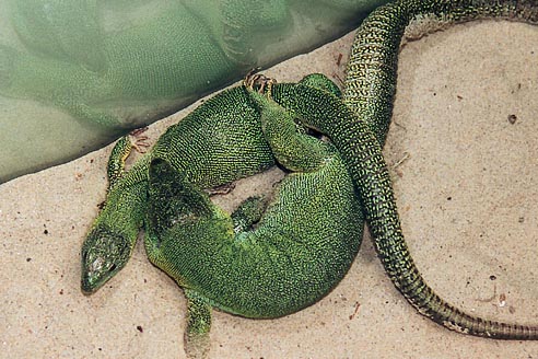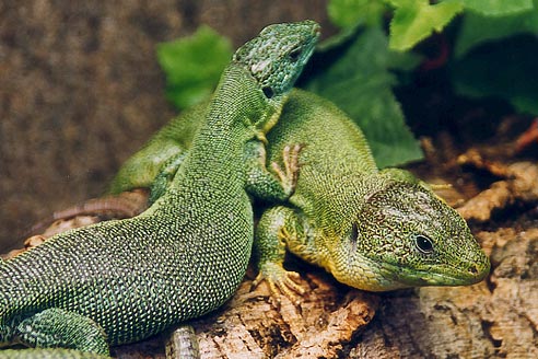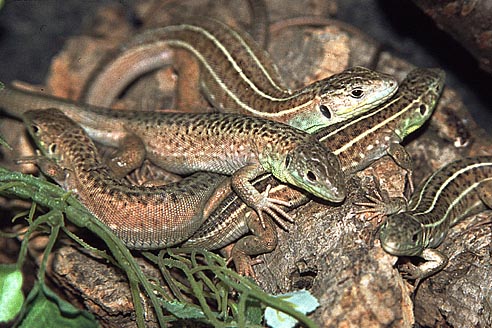 In freier Natur werden Reviergrenzen oft heftig gegenüber anderen Artgenossen verteidigt. Vor allem Männchen gehen bei Grenzverletzungen nicht zimperlich miteinander um. In der räumlichen Begrenztheit des Terrariums wäre es einem unterlegenen Tier unmöglich, auf Dauer den Attacken eines stärkeren Artgenossen auszuweichen. Deshalb ist es besonders wichtig, gut harmonierende Paare oder Gruppen zu bilden. Ein Rezept gibt es dafür allerdings nicht. Vielmehr sind Fingerspitzengefühl und Einfühlungsvermögen des Halters gefragt. Ein Vorteil besteht aber darin, wenn man die Eidechsen bereits als Jungtiere aneinander gewöhnen kann. In den seltensten Fällen ist es möglich, mehrere Männchen in einem Terrarium zu halten. Ein Männchen zusammen mit mehreren Weibchen läßt sich leichter realisieren. Dies ist auch in Hinblick auf Nachzuchtversuche günstiger. Trotzdem sollte immer eine Möglichkeit zur Trennung vorhanden sein.