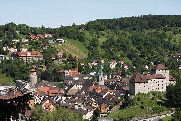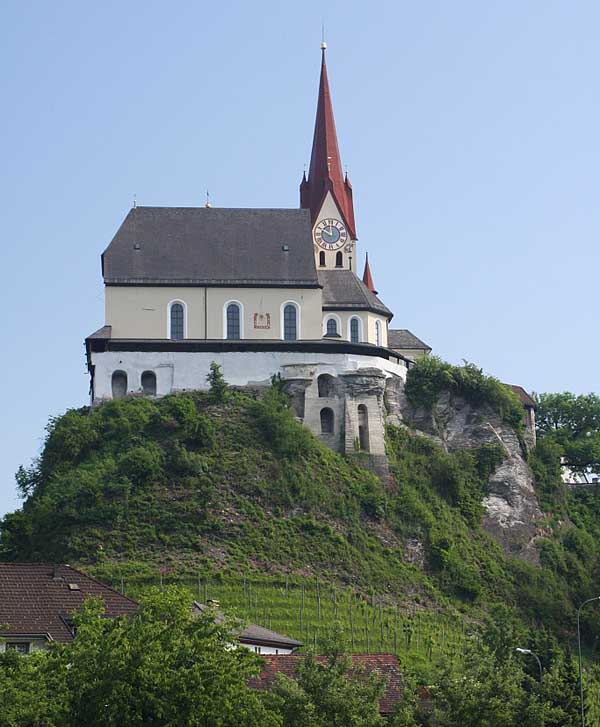 Abb. 1 Die Verbreitungszentren der Feldkircher Mauereidechsen auf einen Blick: im Vordergrund die Schattenburg mit der Altstadt, im Bildhintergrund der südliche Ardetzenberg mit dem dominierenden Institut St. Joseph.