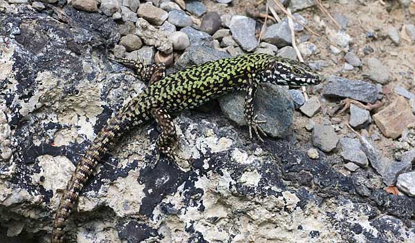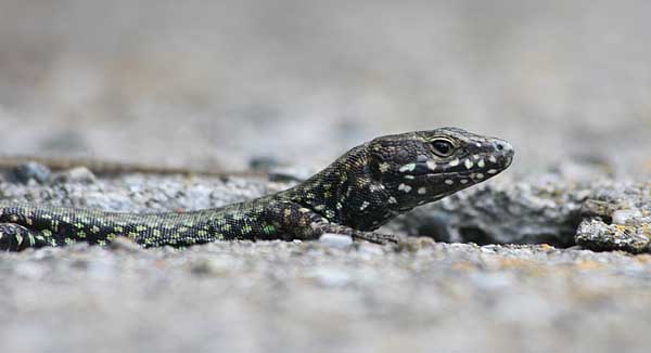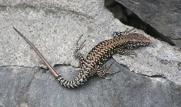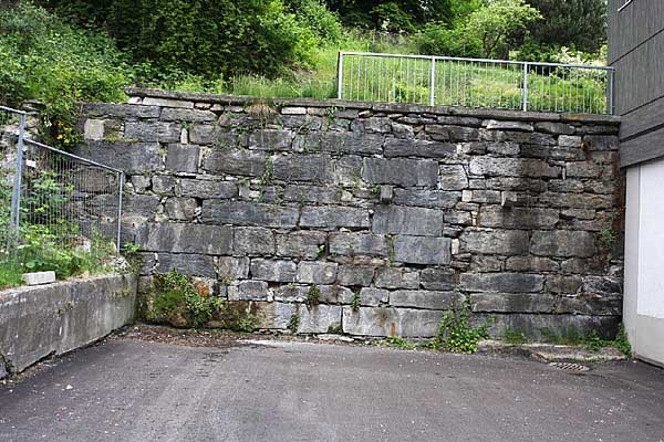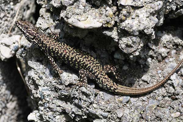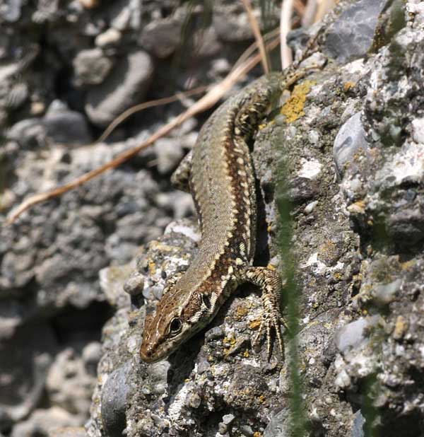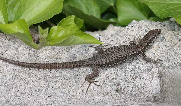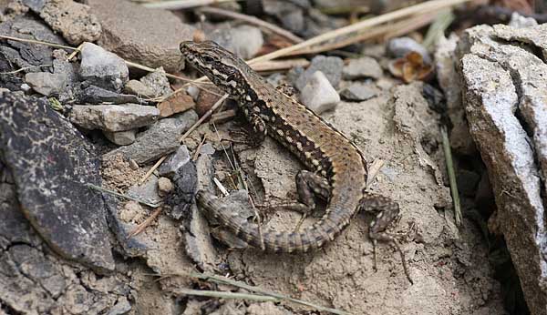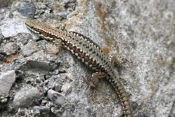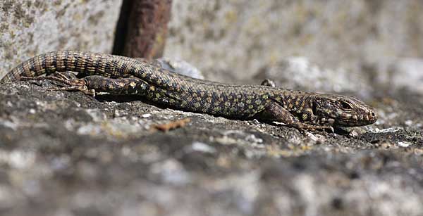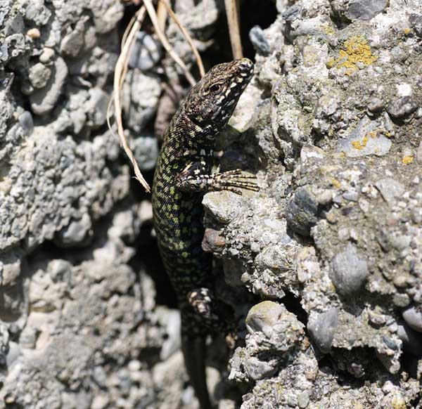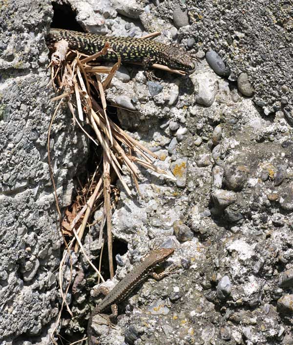 Auf dem Weg in Richtung Norden gelangt man an einer hohen Blocksteinmauer vorbei, an der seit 2007 Mauereidechsen zu finden sind – seit 2008 auch Jungtiere und Schlüpflinge. Offenbar pflanzen sich die Tiere hier erfolgreich fort. Zu unserer Überraschung fanden sich nicht nur Eidechsen im oberen Mauerbereich sondern auch ein junger Bergmolch (Mesotriton alpestris) an einem Vorsprung im unteren Bereich.