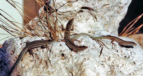 Laut dem „Gutachten über die Mindestanforderungen an die Haltung von Reptilien“ (BUNDESMINISTERIUM FÜR ERNÄHRUNG, LANDWIRTSCHAFT UND FORSTEN 1997) muss ein Terrarium für ein Pärchen von Vertretern aus der Familie Lacertidae eine Mindestgröße von 6 x 4 x 4 (Länge x Breite x Höhe) multipliziert mit der KRL der zu pflegenden Art betragen. Für Podarcis pityusensis kamerianus würde dies bei einer KRL von etwa 8 cm bedeuten, dass das Terrarium mindestens 48 x 32 x 32 cm groß sein müsste. Dies ist aber doch ein wenig zu klein bemessen, vor allem dürfte es sich auch als schwierig erweisen, in einem solch kleinen Behälter ein deutliches Temperaturgefälle zu schaffen. Daher würde ich ein geräumigeres Terrarium von z. B. 80 x 50 x 50 cm oder 100 x 40 x 50 cm für die Haltung eines Pärchens Esparto-Pityuseneidechsen empfehlen. Man muss bei der Pflege von Pityuseneidechsen darauf achten – wie eigentlich bei den meisten Echsen überhaupt –, dass man keine zwei Männchen zusammen im Terrarium pflegen kann. Am besten hält man Pityuseneidechsen daher paarweise, denn auch die Weibchen würden sich untereinander streiten, sodass es zu Beißereien kommen würde, die mitunter ernsthafte Folgen für das unterlegene Tier haben könnten. Ich halte meine Pärchen daher paarweise in Terrarien mit den Maßen 100 x 40 x 45 cm bzw. auch 50 x 50 x 50 cm.