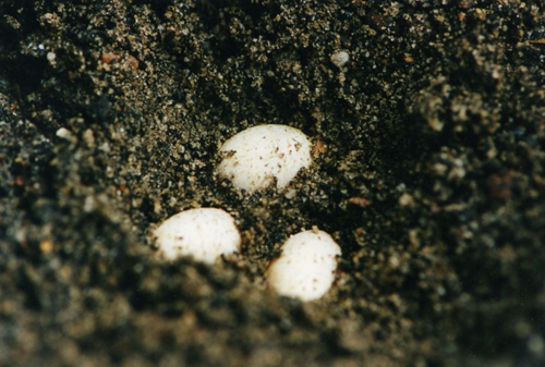 Etwa 13–23 Tage nach der ersten beobachteten Paarung kam es jeweils zur Eiablage. Hierbei suchte das Weibchen den Wurzelbereich der Pflanzen auf, der stets leicht feucht war. Die Gelege bestanden bisher jeweils aus 3–5 Eiern, die direkt nach der Ablage 15 x 8 mm messen. Ich entnehme die Eier – ohne sie um die Längsachse zu drehen – aus dem Terrarium und bette sie in Heimchendosen, die mit einem leicht feuchten Erde-Sand-Gemisch gefüllt sind. Dabei werden die Eier ungefähr 3 cm tief ins Substrat eingegraben und anschließend in ein Terrarium gestellt und bei Temperaturen zwischen 20–33 °C gezeitigt. Bei diesen Temperaturen (also mit Nachtabsenkung) beträgt die Inkubationszeit zwischen 41–64 Tagen. Diese recht großen Unterschiede in der Zeitigungsdauer kommen dadurch zustande, dass die relativ früh – manchmal bereits im Februar oder März – abgelegten Eier noch etwas niedrigeren Temperaturen und größeren Temperaturschwankungen ausgesetzt sind als Gelege, die im Mai abgesetzt wurden und dementsprechend bei etwas höheren Temperaturen, die dann im Terrarium herrschen, gezeitigt werden.