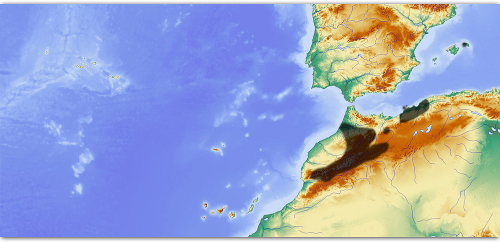 Humid parts of the Atlas Mountains and coastal areas of central and northern Morocco and northwestern Algeria. Introduced to the island of Menorca, the Habibas Islands and the island of Paloma in Algeria.