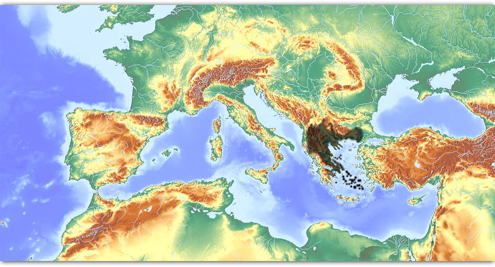 Southern Bulgaria, southern Serbia, Macedonia, Albania, and Greece including many of the Aegean Islands.