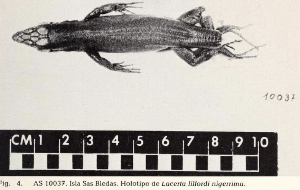 | Lacerta lilfordi nigerrima SALVADOR, 1979 Podarcis lilfordi nigerrimus BÖHME & KÖHLER, 2005 Illot de ses Bledes ESU PÉREZ-CEMBRANOS et al., 2020 |