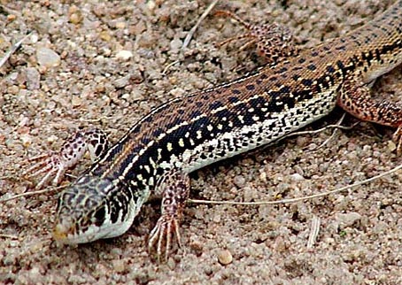 Sandveld lizards (genus Nucras) are widespread in southern Africa, but are generally secretive and poorly known. We examined 385 preserved specimens from five species of Nucras collected over a broad time span (104 years) and a geographic area covering most of South Africa and Swaziland. We had three main objectives: to test for sexual size dimorphism, to quantify male and female reproductive cycles, and to determine diet. In addition, we examined the importance of scorpions in the diet of Nucras based on previous studies reporting an unusually high incidence of scorpions in the diet of Kalahari N. tessellata. Males of all species except N. lalandii had significantly larger heads than females of the same body size, although females had significantly greater snout–vent length than males in three of the five species examined. The general reproductive pattern was for females to contain vitellogenic eggs during late spring and early summer. No females simultaneously contained oviductal and vitellogenic eggs, which suggests that females produce only one clutch per season. Clutch size was unrelated to female body size in all species examined. Female follicle volume generally coincided with male testicular volume, indicating for the most part synchronized reproductive cycles between the sexes. Testis volume was generally highest during spring–early summer, with only N. holubi showing a second peak in autumn. We recorded 15 arthropod orders in the diet of Nucras. All species feed on invertebrates, primarily insects, and, to a lesser degree, spiders and centipedes. Termites, grasshoppers, and beetles both numerically and volumetrically dominated their diet. We found no evidence that scorpions form a major part of the diet of any of these five species of Nucras, including N. tessellata from biomes outside the Kalahari Desert.