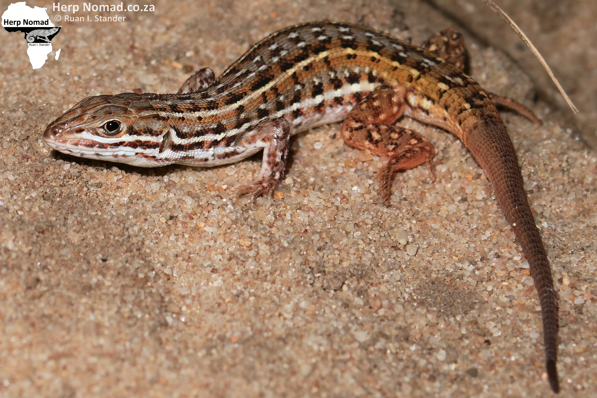 Eremiadinae, one of three subfamilies of Lacertidae, are distributed throughout Asia and Africa. Previous phylogenetic studies suggested that one of the main groups of Eremiadinae (the Ethiopian clade) consist of two clades with predominately East-African and South-African distribution. Yet, especially the latter one, which includes the genera Pedioplanis, Meroles, Ichnotropis, Tropidosaura and Australolacerta, was not well supported in the molecular phylogenetic analysis. In this study, we analysed the phylogenetic relationships among the genera of the ‘South African clade’ to assess whether this group actually forms a highly supported clade and to address questions concerning the monophyly of the genera. We sequenced sections of the widely used mitochondrial genes coding for 16S rRNA, 12S rRNA and cytochrome b (altogether 2045 bp) as well as the nuclear genes c-mos, RAG-1, PRLR, KIF24, EXPH5 and RAG-2 (altogether 4473 bp). The combined data set increased the support values for several nodes considerably. Yet, the relationships among five major lineages within the ‘South African clade’ are not clearly resolved even with this large data set. We interpret this as a ‘hard polytomy’ due to fast radiation within the South African lacertids. The combined tree based on nine marker genes provides strong support for the ‘South African Clade’ and its sister group relationship with the ‘East African Clade’. Our results confirm the genus Tropidosaura as a monophylum, while Ichnotropis is paraphyletic in our trees: Ichnotropis squamulosa appears more closely related to Meroles than to Ichnotropis capensis. Furthermore, the monophyly of Meroles is questionable as well. Based on our results, I. squamulosa should be transferred from Ichnotropis into the genus Meroles. Also, the two species of Australolacerta (A. australis and A. rupicola) are very distantly related and the genus is perhaps paraphyletic, too. Finally we propose a phylogeographical scenario in the context of palaeoclimatic data and compare it with a previously postulated hypothesis.