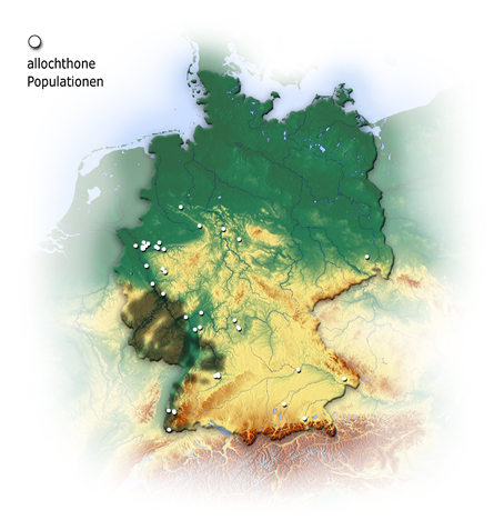 Introduced in Bochum (Botanischer Garten, S-Bahnhof Ehrenfeld), Bonn-Poppelsdorf, Bottrop-Batenbrock, Castrop-Rauxel, Darmstadt-Eberstadt, Dinslaken-Süd, Dortmund (Hengsteysee), Duisburg (Hochfeld, Hüttenheim, Innenhafen, Ruhrort-Hafen), Frankfurt, Gernsheim, Holte-Stukenbrock (Schloss), Ihringen (Kaiserstuhl), Kamenz, Kamp-Lintfort, Karlstadt, Kelheim, Mainz (Budenheim), Monheim, München-Aubing, Neuwied (Engerser Feld), Nörten-Hardenberg, Oberhausen (Neue Mitte), Osnabrück, Rosenheim-Kolbermoor, Stahle (Rötanschnitt), Stuttgart (Bad Canstatt, Kriegsberg, Travertinpark, Wangen, Untertürkheim), Remshagen, Tittling, Veitshöchheim, Weiershagen, Würzburg.